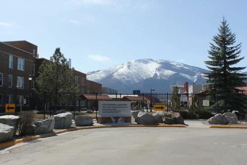 The National Institutes of Health’s Rocky Mountain Laboratories campus in Hamilton is flanked by boulders in front and mountains in back.(Katheryn Houghton/KFF Health News)