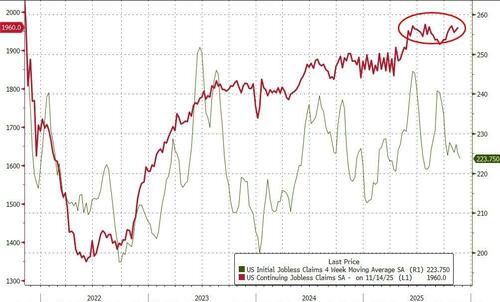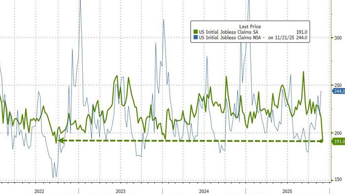 With the spice flowing once again (post shutdown), initial jobless claims continue to signal no labor market pain at all… plummeting last week to 191k (the lowest since Sept 2022 and before that the lowest since 1969!!)