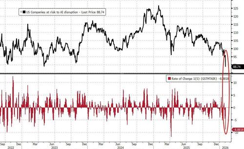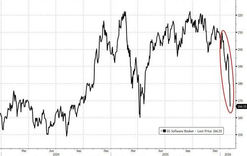 As Goldman’s Nelson Armbrust confirmed, jitters forming over the past few days have quietly built a tinderbox that suddenly exploded to the downside, with AI and Software concerns significantly broadening out across names & sectors that previously had been immune to the narrative.