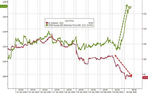 ‘It was the best of times, it was the worst of times’ is how one big bank trader described yesterday’s price action as Dickens’ Tale Of Two Cities intro perfectly described the to-ing and fro-ing with the US Tech sector as the once one-way trade in anything TMT has dispersed aggressively with winners and losers being ‘picked’ as Anthropic reminded investors that AI disruption risk is no longer theoretical.