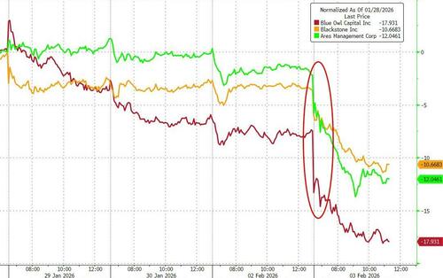 But, as we detailed here, here, here , and here yesterday, the pain was not just in tech, as Alts and BDCs suffered significant losses as the strain of lower marks on loans to losing software firms weighed on these private credit providers (which was exacerbated by the fact that a group of banks led by Deutsche Bank has been unable to sell about $1.2 billion of loans backing the acquisition of a software provider).