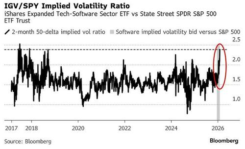 In options-land, the implied volatility of software stocks is blowing out versus the S&P 500 ETF…