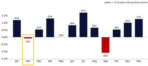 Finally, as we detailed yesterday, historically, February has been the second weakest month of the year, with the S&P 500 averaging -9bps since 1928 and posting the second-lowest hit rate of any calendar month.