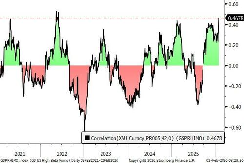 Goldman recently highlighted the correlation between Momentum and Gold is at multi-year highs which is driven by the surge in mining stocks.