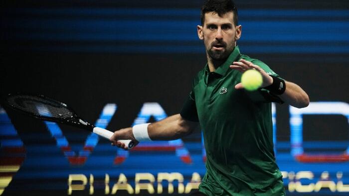 Novak Djokovic, of Serbia, plays a shot against Yannick Hanfmann, of Germany, during the ATP250 tournament semifinal tennis match in Athens, Greece, Nov. 7, 2025. Thanassis Stavrakis/AP Photo