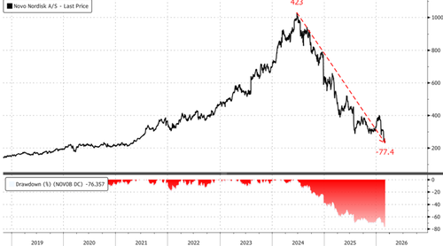 Meanwhile, Novo’s biggest bull, Goldman analyst James Quigley, downgraded the stock from “Buy” to “Hold” earlier this week. Quigley’s full note can be viewed here and is available to pro subs.