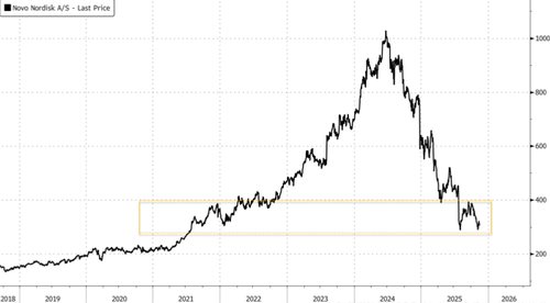 Just before the US cash session, Novo Nordisk A/S announced it will slash prices on Wegovy and Ozempic in a direct challenge to Eli Lilly’s obesity drug, aiming to regain market share. The announcement comes just weeks after President Trump finalized a deal with Novo and Lilly to reduce costs as part of the administration’s affordability push ahead of next year’s midterms.