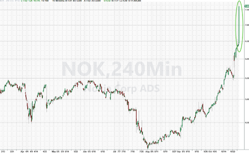Just ahead of the lunch hour in New York, Bloomberg reported that Nvidia will invest $1 billion in Nokia, acquiring a 2.9% stake by purchasing 166 million shares at $6.01 each. The headline was enough to catapult Nokia’s shares in Europe up 17%. U.S.-listed shares were briefly halted, now up 21%.