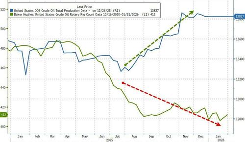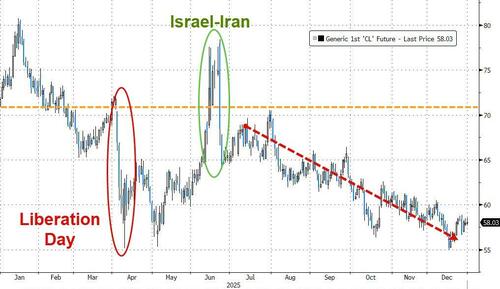 As Dow Jones reports, the unwinding of OPEC+ output cuts, along with higher non-OPEC production, fueled oversupply concerns in 2025, while U.S. sanctions and geopolitical tensions in the Middle East, Russia-Ukraine and more recently Venezuela led to frequent price spikes.
