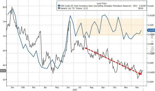 The US Crude Oil Total Inventory (excluding Strategic Petroleum Reserve) fell to 422,888 thousand barrels in the week ending Dec. 26, 2025, lowest since Oct. 31, 2025… decoupling from the crude price…