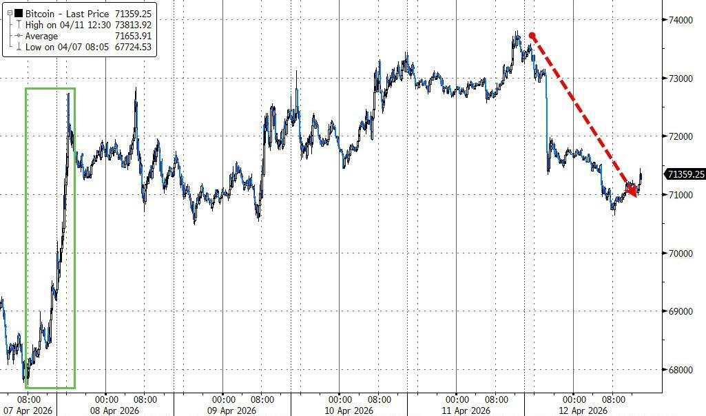 The moves point to a softer tone for risk assets and sure enough bitcoin is down notably, but still up from pre-ceasefire levels…