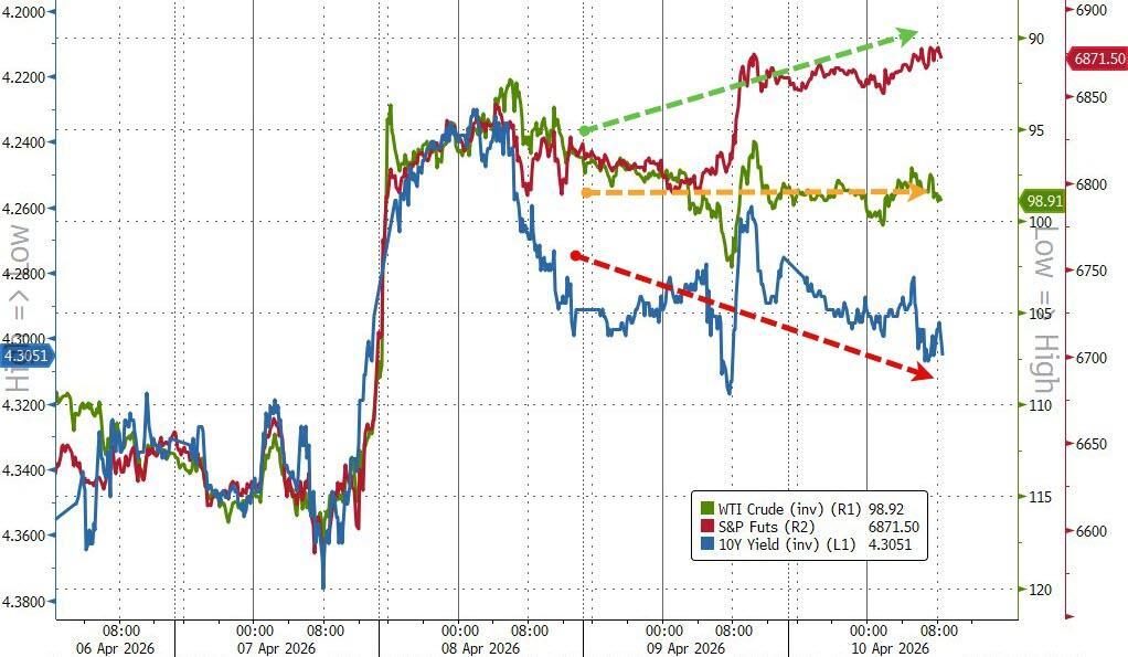 All eyes are of course on the oil markets where hyperliquid perps were signaling a major jump higher as traders react to peace talks falling apart over the weekend, and the US moving to blockade the Strait of Hormuz in response.