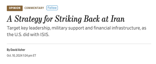 By late 2024, Asher penned an op-ed in the Wall Street Journal titled “A Strategy for Striking Back at Iran“…