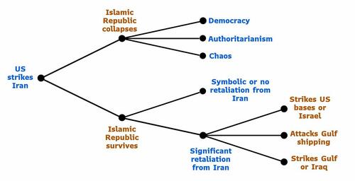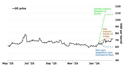 For its part, Bloomberg’s economists thing Iran’s response will continue to escalate. While it can’t match the US’ military superiority, Iran can impose significant costs and seek to bog the US down in the region. Iran’s targets already include US bases in the region and Israel. Tehran could expand to energy infrastructure and regional shipping routes, either directly or through its partners in the region. That includes the Houthis in Yemen, who’ve said they’ll resume their disruption of shipping in regional waters. The possible outcomes are laid out in the chart below.