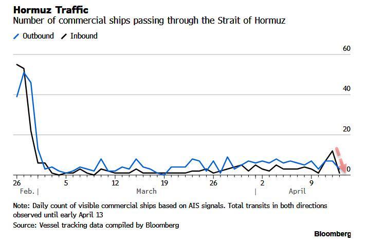 One day after a burst of traffic through the Strait of Hormuz, when according to Bloomberg 19 ships crossed in either direction while Trump said that as many as 34 ships crossed the waterway on Sunday, shipping through Hormuz slumped back down again Monday, reversing Sunday’s jump, as caution mounted ahead of a US naval blockade.