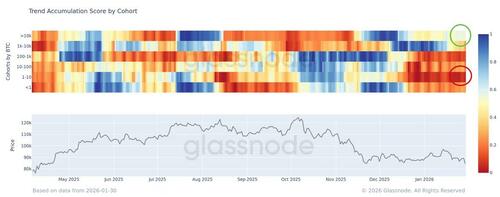 According to Glassnode data, the largest whales are in a “light accumulation” phase and have maintained a neutral-to-slightly-positive balance trend since bitcoin fell to $80,000 in late November. During this period, price has largely consolidated, trading within a $80,000 to $97,000 range through the end of January.