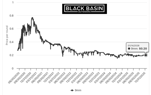 Now, with renewed left-wing chaos emerging in Minneapolis and a clearer understanding of how violence is used as a political pressure against the Trump administration by unhinged left-wing activists, the setup becomes even clearer. Elevated social unrest risk is returning – all other metals are much higher, but ammunition prices for the most common round in America, 9mm, remain depressed around 20 cents per round.