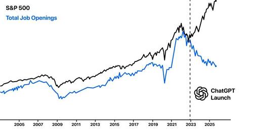 It’s a long-term view of job openings (blue) vs the S&P 500 (black). The dotted line shows when ChatGPT launched in November of 2022.