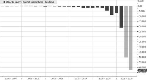 There was no mention of what 2027 capex will be, so expect some very pointed questions on the call because alongside massive capex comes just as massive cash burn, which, as shown below… is terrifying. As readers are well aware, the question for the past 6 months has been: just how much debt will ORCL need to fund it?
