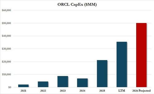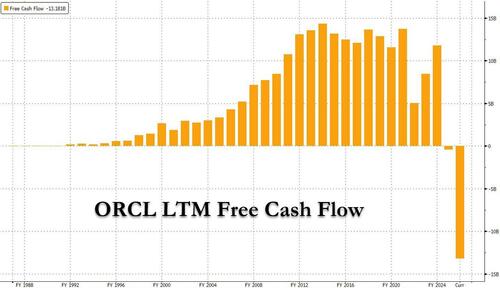 That’s when the bottom fell off the stock as investors were promptly reminded of Barclays calculation from a month ago (when the bank downgraded ORCL bonds and recommended buying its CDS), that unless something changes, Oracle “would run out of cash by the November 2026 quarter, implying substantial funding needs.“