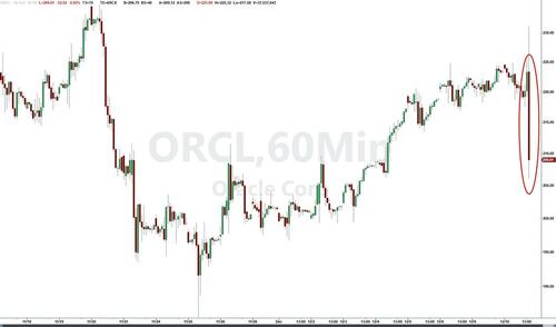 While the Fed’s “not so hawkish” cut was certainly better than what the market expected, largely thanks to the very dovish addition of $40BN in not QE monthly Reserve Management Purchases of T-Bills, there was another key event today and, as we previewed earlier, that was Oracle’s second quarter results. And unlike the Fed, this one was not nearly as good for risk assets: the company reported earnings which beat estimates, but the top line was a mess, with cloud growth missing across the board, and margins also disappointing, sending the stock lower after hours.