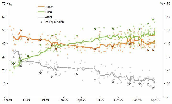 Independent pollsters like Medián consistently show Tisza at 55–58% and Fidesz at 35–38%, with “Other” parties collapsing into single digits.