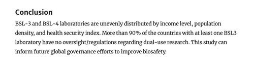 “We identified 3,515 BSL-3 laboratories in 149 countries, with nearly half (47.1%) in the United States. Details on geolocations and pathogens they handled are publicly available for 955 of these labs. The United Kingdom had the highest rate (N = 9) of BSL-3 labs per million population, while Bangladesh had the lowest. High-income countries house 82% of these laboratories. There are 110 BSL-4 laboratories in 34 middle- and high-income countries, and 46% are in the WHO’s Europe region. Notably, from the health security index perspective, 91.6% of countries with at least one BSL-3 laboratory lack guidelines for dual-use research of concern.”