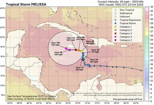 Tropical Storm Melissa continues to meander in the central Caribbean Sea on Oct. 23, its future path and strength still confounding meteorologists, who are now raising alarms about how strong the storm could become.