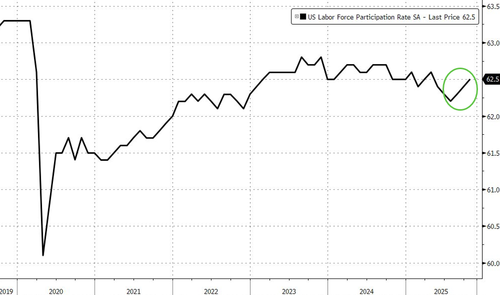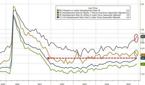 But while payrolls were generally solid, the unemployment rate was a problem and is what will likely prompt the Fed to cut more: in November, the unemp rate rose to 4.6% (with October blank), worse than the 4.5% estimate and the highest since Sept 2021.