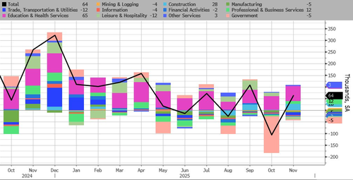 Here are the details: in October, the US lost 105K jobs, entirely due to a plunge in government jobs (more below) but this was offset by the November jump of 64K jobs, which came in higher than the 50K expected.