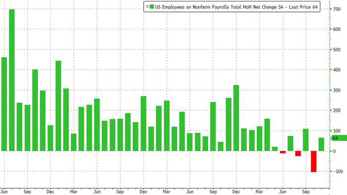 Here are the details: in October, the US lost 105K jobs, entirely due to a plunge in government jobs (more below) but this was offset by the November jump of 64K jobs, which came in higher than the 50K expected.