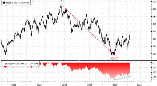 Pepsi shares were marginally higher in premarket trading in New York. Shares remain -20% from their peak, when they nearly topped $200 per share in mid-2023.
