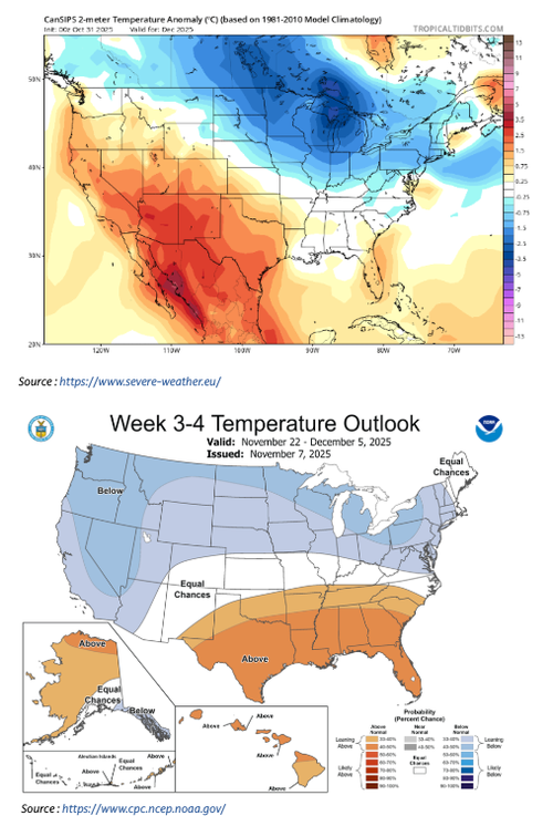 A disruption in the PV is forecast, with higher pressure building over Canada next week, we could see a Sudden Stratospheric Warming (SSW) trigger. Most SWW occur in mid to late winter, however this is early. The temperature forecast for early December indicates a potentially strong cold polar air outbreak across the northern, central, and eastern United States. Snowfall forecasts for early December also show a spread from Canada across to the north, north west and north east of the U.S. (The image below is the average long range temperature forecast). In Europe, the same snowfall pattern is being seen in the far north of the Scandis, however with the location of the low-pressure areas, the eastern side of Europe looks like a warmer anomaly. In terms of trading, Henry Hub is on its highs, the desk favour buying Dec puts as insurance if this weather does not materialise. If the cold does come, the market will need to price pulling storage harder and earlier, so front spreads should be in favour. Russell flags that if weather hits then “Z/F/G or Z/F vs H/J both look like they should carry well.”
