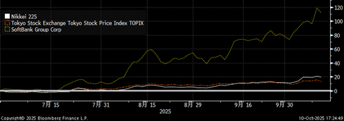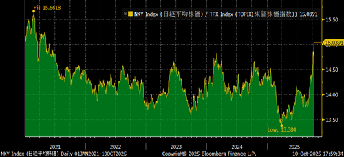 The week began with the October 4 LDP leadership race, where Sanae Takaichi delivered a surprise victory, contrary to market predictions favoring Koizumi. This, alongside Ishiba’s September 2024 win, underscores the LDP’s opaque internal power dynamics, often misread by seasoned observers. The market reacted swiftly and forcefully; with the Nikkei already at all-time highs, Monday saw a 4.8% surge, the fourth-largest point gain on record, mirroring the 4.8% drawdown after Ishiba’s victory a year prior.