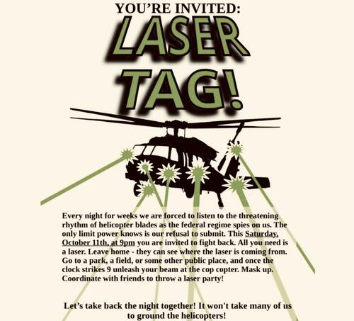 “Every night for weeks we are forced to listen to the threatening rhythm of helicopter blades as the federal regime spies on us…This Saturday, October 11th, at 9pm you are invited to fight back. All you need is a laser. Leave home — they can see where the laser is coming from. Go to a park, a field, or some other public place, and once the clock strikes 9 unleash your beam at the cop copter.