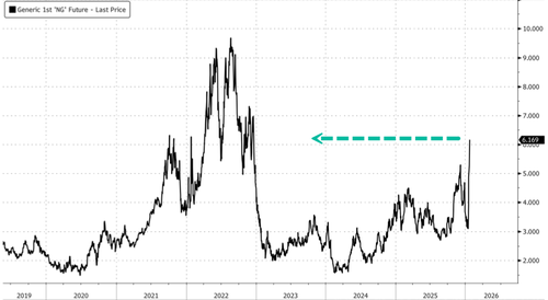 UBS analyst David Robinson told clients, “Natural gas futures have surged nearly 20% Monday Asia morning as the worst winter storm in recent years in the US has seen surging demand for heating, with plunging temperatures knocking off nearly 10% of production.”