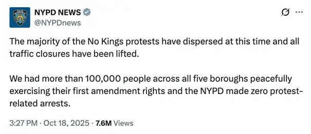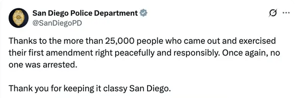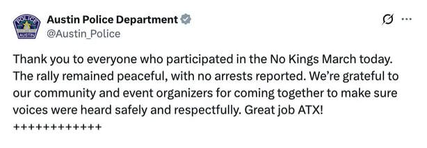 The protests were overwhelmingly peaceful—so much so that police in New York City, Austin, and San Diego all reported zero protest-related arrests, which is frankly remarkable given the scale of participation.