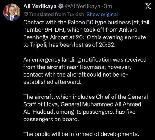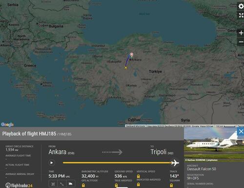 In what could be the start of a major geopolitical crisis, moments ago Turkish Interior Minister Ali Yerlikaya said in a post on X that contact was lost with the private jet which was carrying Libya’s Army Chief of Staff, Mohammed Ali Ahmed al-Haddad, and four other passengers.