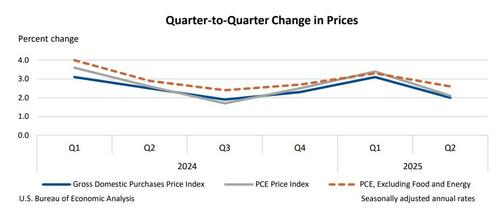 For Q2, the price index for gross domestic purchases increased 2.0% in the second quarter, revised up 0.2% from the previous estimate. The personal consumption expenditures (PCE) price index increased 2.1 percent, revised up 0.1 percentage point. Excluding food and energy prices, the PCE price index increased 2.6 percent, also revised up 0.1 percentage point.