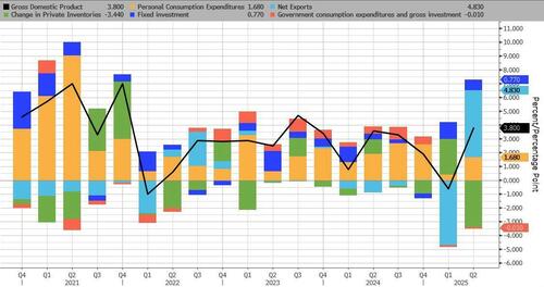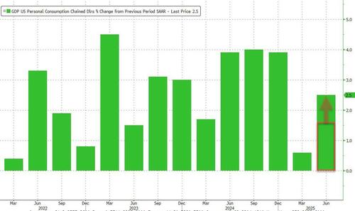 It started off as 2.960%; one month later it was revised higher to 3.290%, and moments ago the Bureau of Economic Analysis reported that Q2 GDP was revised once again, and even higher this time, to a whopping 3.830%, the highest print in nearly two prints, since the 4.70% in Q3 2023, and primarily reflecting an upward revision to consumer spending.
