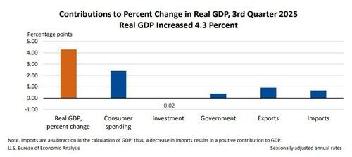 By now, Q3 GDP – which should have been reported almost two months ago – is ancient history but it still matters in a world where the Fed’s every sneeze is overanalyzed. Which is why the report by the Bureau of Economic Analysis that in Q3 US GDP surged by 4.3%, up from an already hot 3.8% in Q2 and driven by a spike in consumer spending, will surely raise some eyebrows (for those wondering, this report was originally supposed to hit on Oct 30, and the second estimate was scheduled for Nov 26; none of that happened due to the govt shutdown). This was the highest annualized quarterly GDP print since Q3 2023.