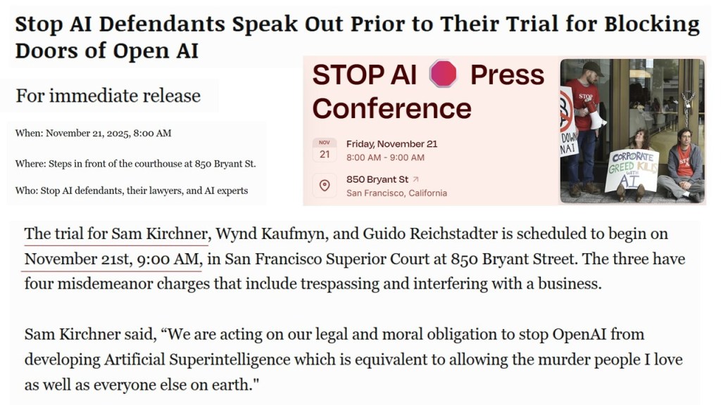 On January 6, 2025, Kirchner and Reichstadter went on trial for blocking the entrance to OpenAI on October 21, 2024, to “stop AI before AI stop us” and on September 24, 2024 (“criminal record doesn’t matter if we’re all dead”), as well as blocking the road in front of OpenAI on September 12, 2024.