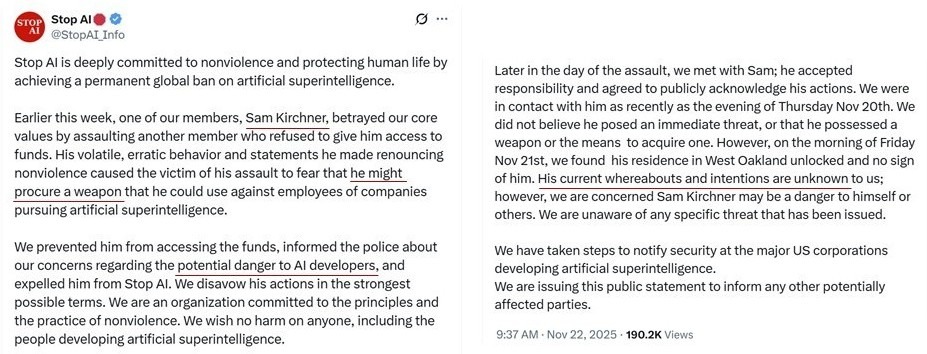 The article did not mention his name but hinted that, before his disappearance, he had stated he was “no longer part of Stop AI.”1 On November 22, 2025, the activist group’s Twitter account posted that it was Sam Kirchner, the cofounder of “Stop AI.”