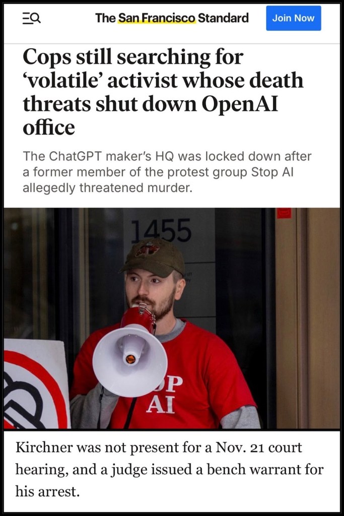 Early December, the SF Standard reported that the “cops [are] still searching for ‘volatile’ activist whose death threats shut down OpenAI office.” Per this coverage, the San Francisco police are warning that he could be armed and dangerous. “He threatened to go to several OpenAI offices in San Francisco to ‘murder people,’ according to callers who notified police that day.”