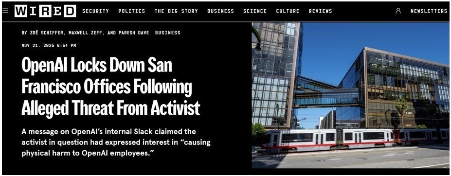 On November 21, 2025, Wired reported that OpenAI’s San Francisco offices went into lockdown after an internal alert about a “Stop AI” activist. The activist allegedly expressed interest in “causing physical harm to OpenAI employees” and may have tried to acquire weapons.