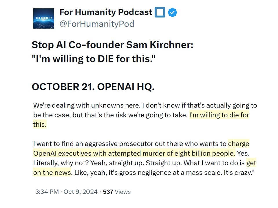 The podcast promoted this episode in a (now deleted) tweet, quoting Kirchner: “I’m willing to DIE for this.” “I want to find an aggressive prosecutor out there who wants to charge OpenAI executives with attempted murder of eight billion people. Yes. Literally, why not? Yeah, straight up. Straight up. What I want to do is get on the news.”