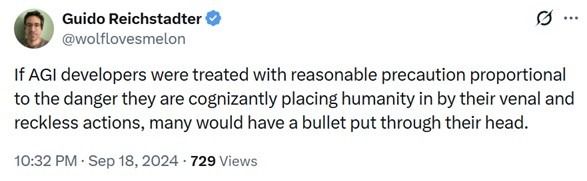 The group’s radical rhetoric was out in the open. “If AGI developers were treated with reasonable precaution proportional to the danger they are cognizantly placing humanity in by their venal and reckless actions, many would have a bullet put through their head,” wrote Guido Reichstadter in September 2024.