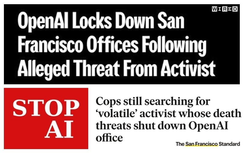A cofounder of a Bay Area “Stop AI” activist group abandoned its commitment to nonviolence, assaulted another member, and made statements that left the group worried he might obtain a weapon to use against AI researchers. The threats prompted OpenAI to lock down its San Francisco offices a few weeks ago. In researching this movement, I came across statements that he made about how almost any actions he took were justifiable, since he believed OpenAI was going to “kill everyone and every living thing on earth.” Those are detailed below.