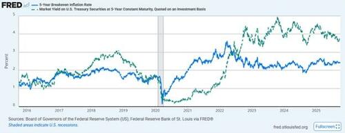 Currently, the yield on a five-year TIPS and a nominal Treasury bond is 1.15% and 3.65% respectively. Thus, the breakeven inflation rate is currently 2.50%.