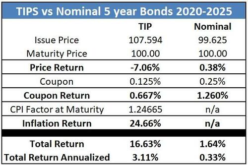 In our opinion, a great way to help readers become better acquainted with TIPS is to illustrate how TIPS have performed over the last five years in comparison to a typical fixed-coupon non-TIP US Treasury bond (nominal bond).